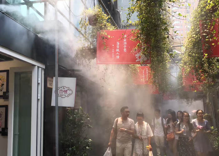 作为上海的3A景区之一,田子坊每天都人头攒动,连日高温让许多游客不能细细品味老上海的弄堂风情。为此,管委会采用了绿友集团自行研发制造的GREENMAN造雾系统,200多个喷头每小时喷雾三次,每次喷雾2分钟,配合弄堂两边墙壁种植的绿化,不仅美化了街景,更对降低整个田子坊的温度起到了有效的作用。现场温度计显示,不进行喷雾的弄堂温度是36 摄氏度,喷雾后,弄堂温度显示33摄氏度,最低的地方温度甚至降到28摄氏度,降温明显。