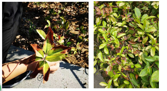 北方地区日照强度大,空气湿度相对较较低,日灼现象十分明显,红叶石楠叶片边缘受高温影响大量失水导致叶片皱缩卷边,开始枯黄,严重影响景观效果。