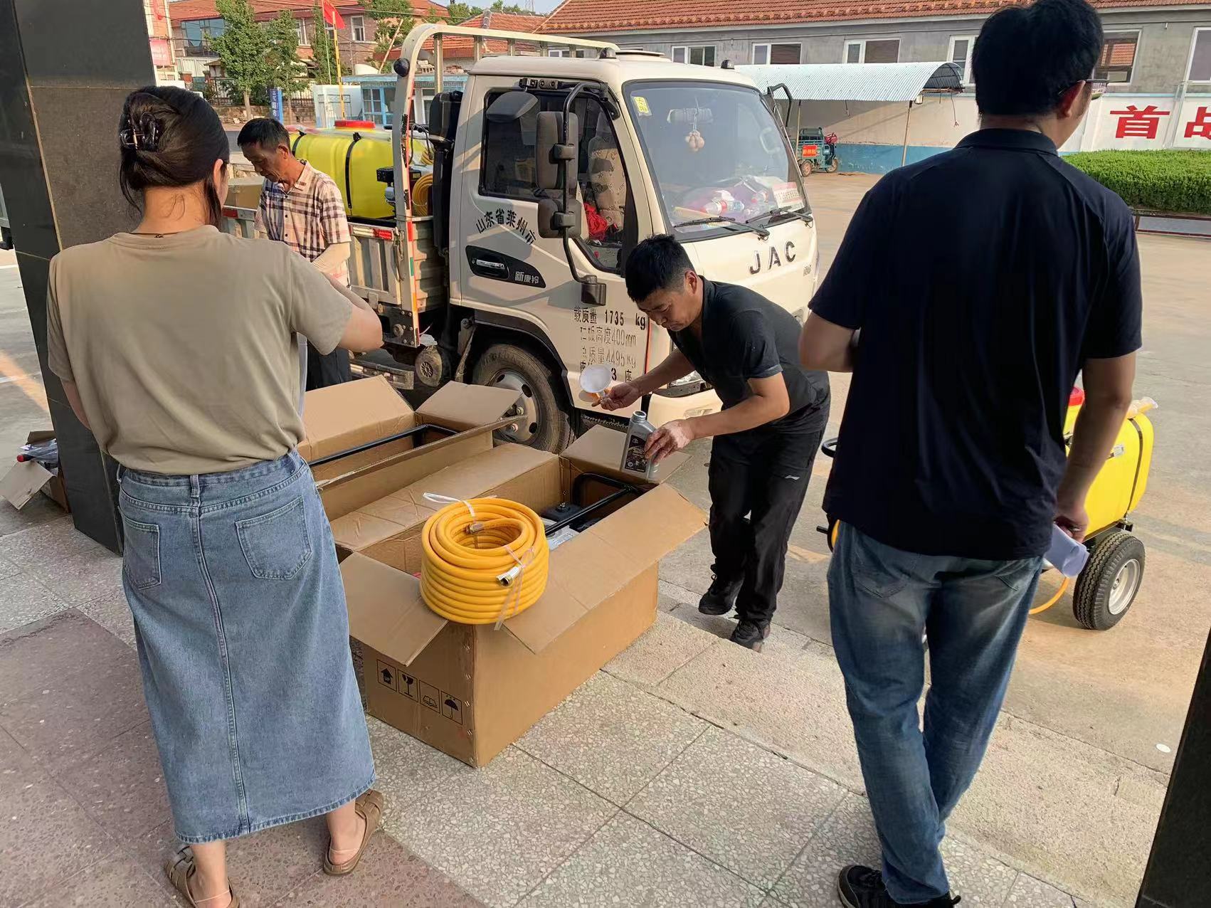 工具到货,为尽快完成供货,潍坊绿友的同事们一件件、一箱箱卸到库房,根据每个镇的需求,按型号按数量分装、核对,为打药机加注机油以便客户使用。汗水模糊视线、打湿衣襟,却毫不影响同事们的工作劲头。
