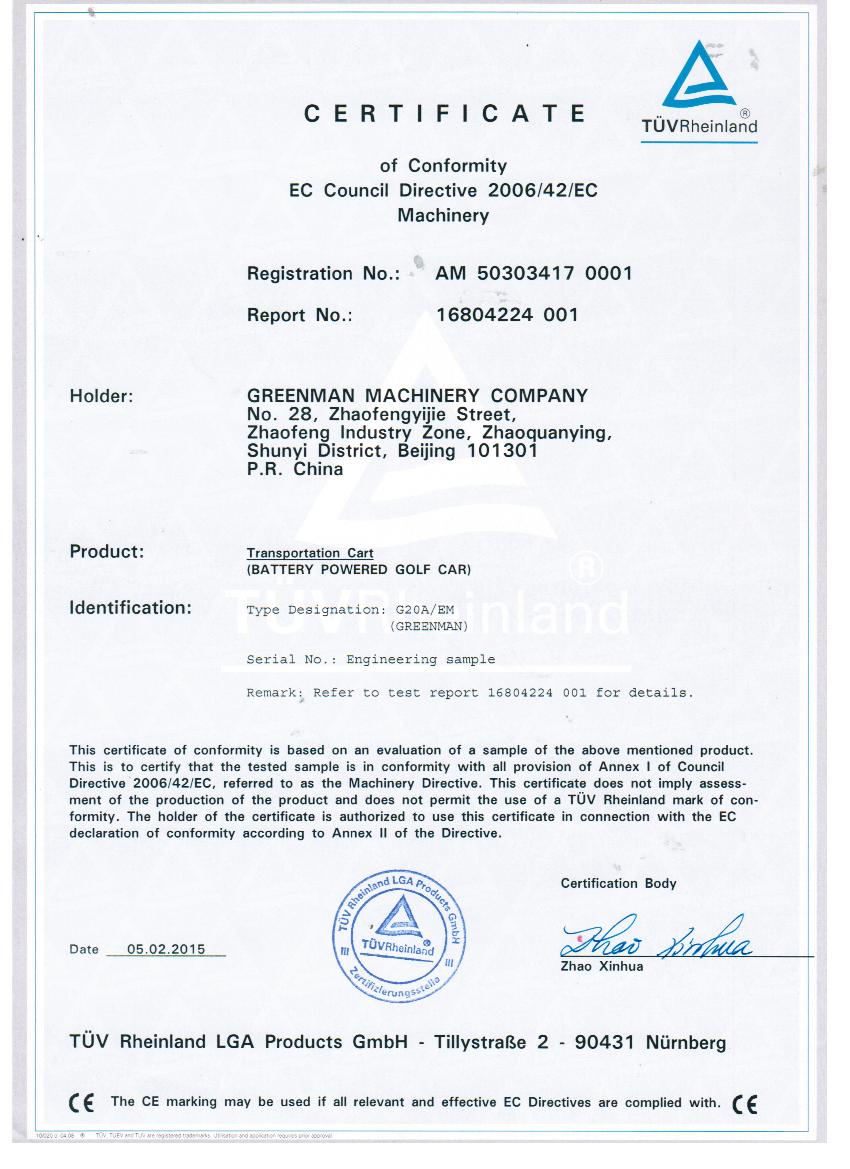 绿友集团自主研发的GREENMAN两座电瓶车golf car通过了CE认证。