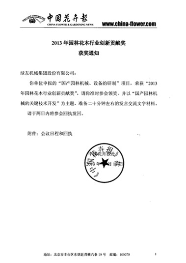 绿友荣获“2013年园林花木行业创新贡献奖”获奖通知: