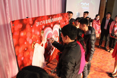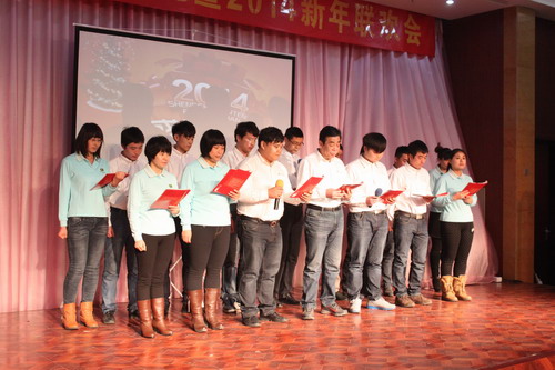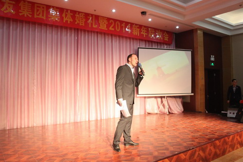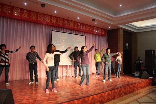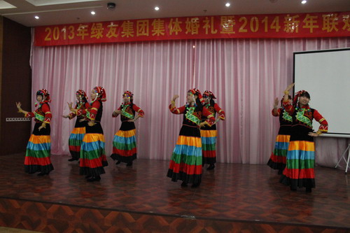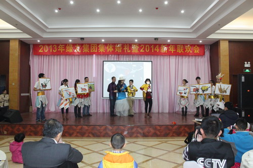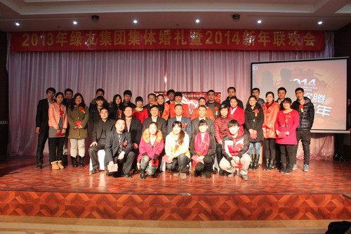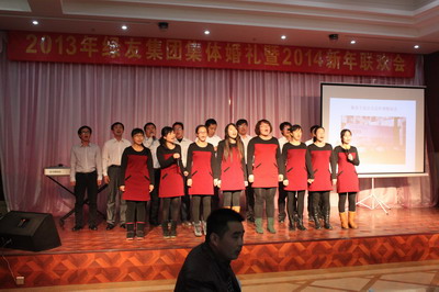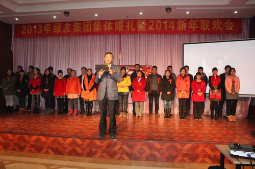 12月29日,“2013年绿友集团集体婚礼暨2014年元旦联欢会”在总部所在地附近的德济缘酒店举办,总部人员和北京绿友园林、北京工厂的全体人员参加了活动;在李敏总裁的关心下,会务组人员还特别邀请了8名退休员工前来参加活动。