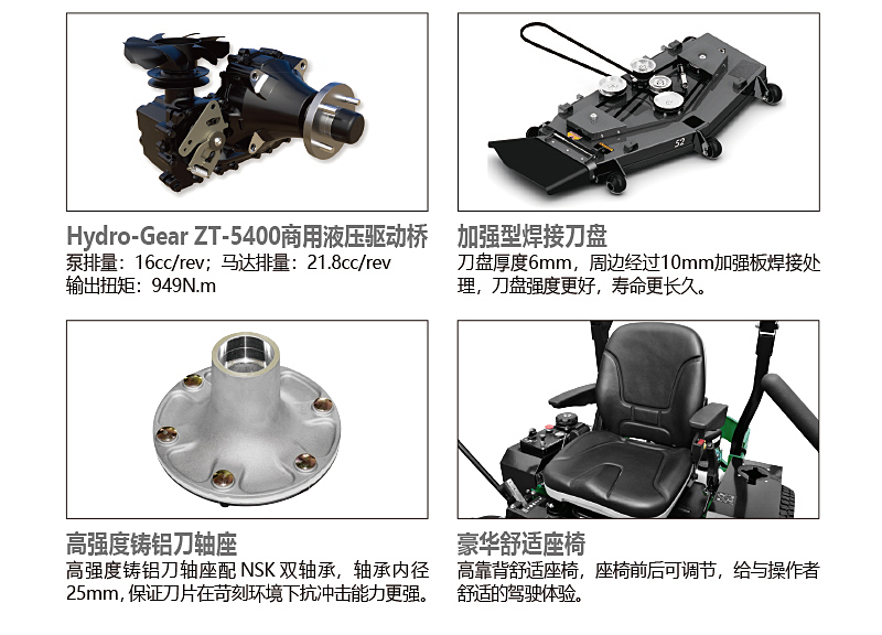 零转弯半径,让您操作更灵活;安全互锁开关和 防翻架设计,给操作者更好的安全保护。