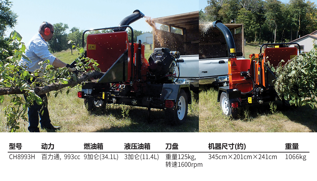 老熊(BEARCAT)品牌树枝粉碎机,配置百力通先锋993cc发动机,最大可切削直径20cm树枝。