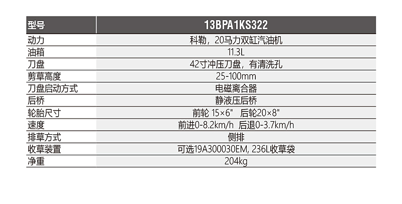 1. 科勒20马力双缸风冷汽油机,油箱11.3L