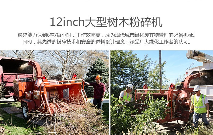 12inch 树木粉碎机每小时粉碎能力达到6吨左右,高效的工作效率成为现代城市绿化废弃物管理的必备机械。同时,其先进的粉碎技术和安全的进料设计理念深受广大绿化工作者的认可。