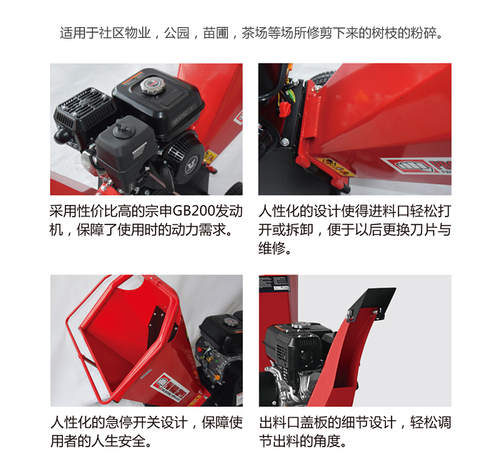 1.整机小巧灵活,适用于社区物业、小型公园、苗圃管理、茶场等绿植的碎枝作业。