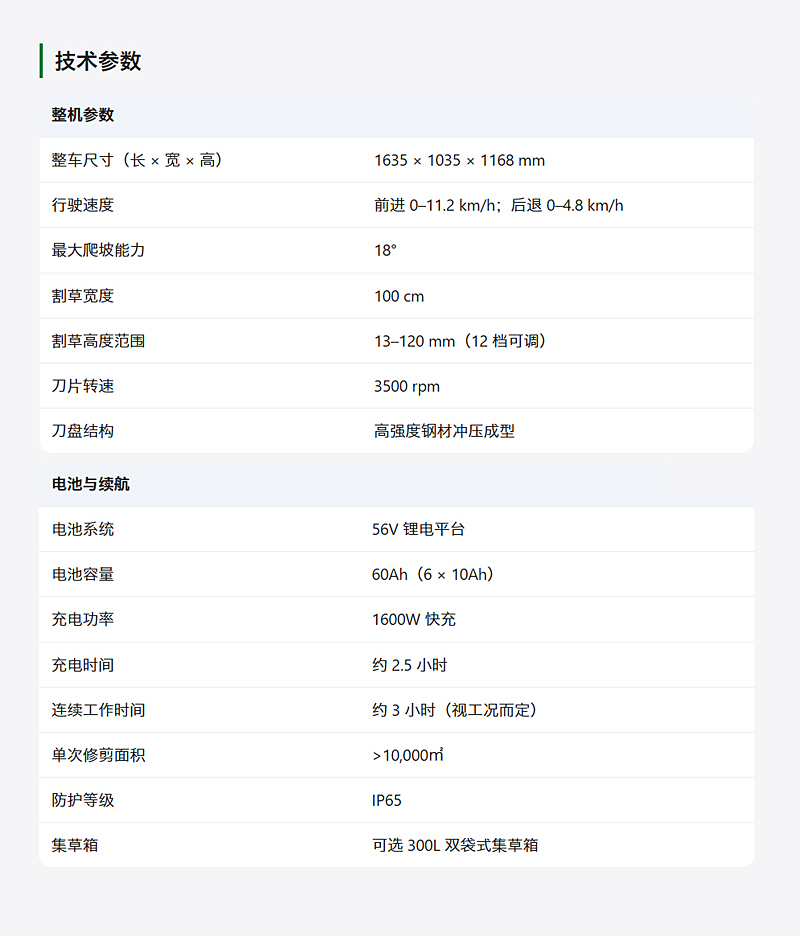 - ● 长效续航能力:60Ah 大容量电池平台,2.5 小时快充,单次修剪面积可超过 10,000㎡。