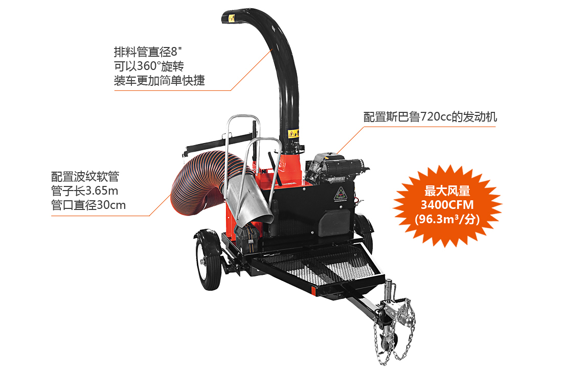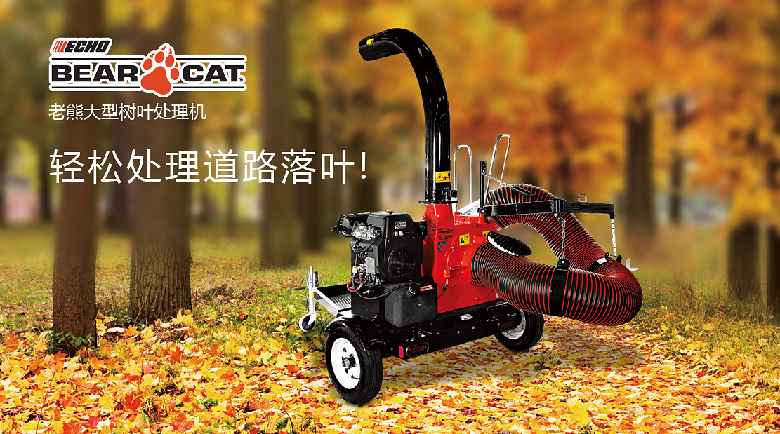 老熊(BEARCAT)品牌大型吸叶机,配置斯巴鲁720cc发动机,30cm直径波纹软管,最大风量可达3400CFM(96.3m³/分钟),轻松进行道路落叶收集。