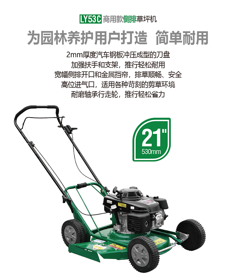 经典纯侧草坪机,是根据国内草坪修剪习惯,设计的一款性价比高的草坪修剪机,结构简单耐用,宽大侧排草开口配置金属金属挡帘,安全耐磨。
