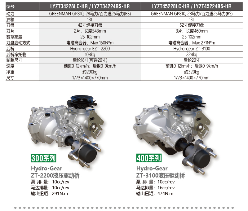 · 选用美国Hydro-gear EZT 液压驱动系统,