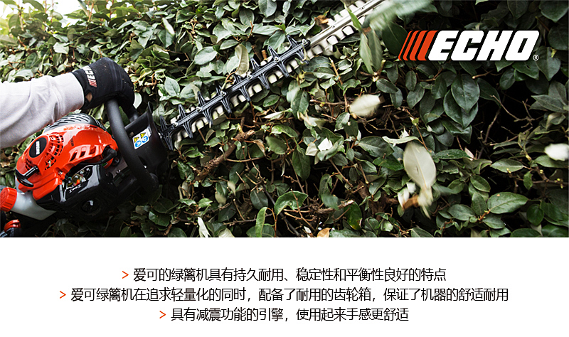 爱可的绿篱机持久耐用,稳定性好。质地轻薄的齿轮装置,锋利耐磨的刀片,以及具有减震功能的引擎共同构成了爱可绿篱机的三大显著特征。我们的绿篱机以符合人体力学为理念,让您的工作省时省力,轻松高效。