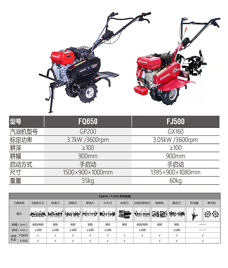 根据土壤硬度和耕作需要可选择标准刀、深耕刀、除草轮、复合刀、开沟器、旱地刀等不同刀具。