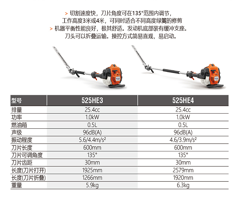 > 切割速度快,刀片角度可在135°范围内调节,工作高度3米或4米,可同时适合不同高度绿篱的修剪。
